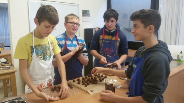 Wer in den Tagen vor der Weihnachtsfeier nachmittags an der Schulküche vorbeigekommen ist, hat einige Schüler der Klasse 7 a und der Klasse 9 e in Aktion erleben können. Es wurde fleißig die Schokolade gehackt, Sahne und Schokolade zu Canache gerührt, Pralinenformen gefüllt und die fertigen Pralinen verziert. Die beliebteste Arbeit aber war, die Pralinen mit der Hand zu „igeln“. Bestand doch die Möglichkeit, die restliche Schokolade am Ende vor dem Händewaschen genüsslich von der Hand zu schlecken.