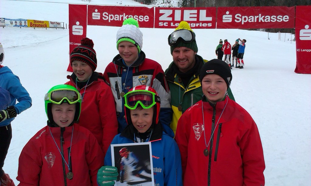 Eine überragende Vorstellung lieferten die Jungen IV am Weltcuphang in Lenggries ab. Tizian S., Felix J., Michael L., Tobias R. und Moritz K. zeigten ihr Können zwischen den Stangen in beeindruckender Weise und festigten hinter dem Werdenfels Gymnasium Garmisch und dem Finsterwald Gymnasium Rosenheim den dritten Platz, welcher zur Qualifikation für das Landesfinale ausreicht. Mit einer Gesamtzeit von 2:22,96 mussten sie sich den Rosenheimern nur 53 Hundertstel geschlagen geben. Somit war die Freude am Hang bei den zahlreich anwesenden Eltern als Zuschauer, Helfern sowie dem Betreuer Johann Fuchs groß, als bei der Siegerehrung die Stockerlplätze vorgelesen wurden. Nun können die Schüler beim nächsten Heimspiel am Lenggrieser Weltcuphang im Landesfinale zeigen, dass sie auch bayernweit konkurrenzfähig sind und eventuell mit einem Auge auf das Bundesfinale schielen... Die Realschule Bad Tölz wünscht viel Erfolg! |