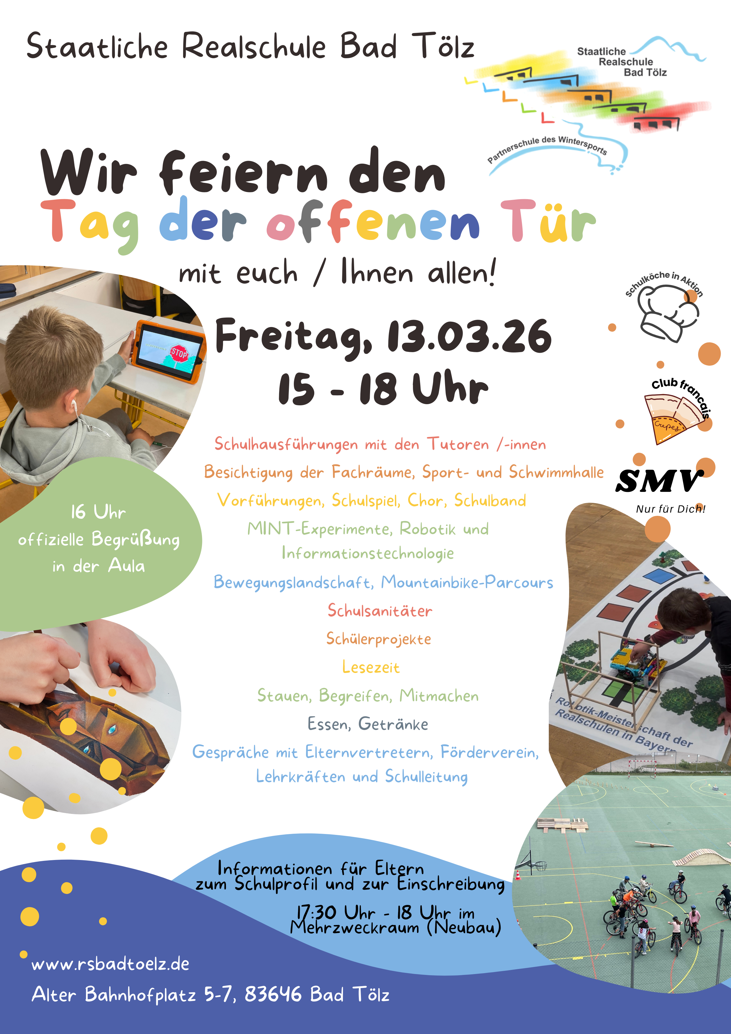 → Schnuppertag in der Woche in der Woche vom 23.03.2026 bis 27.03.2026 (konkreter Termin je nach Grundschule; Anmeldung und weitere Informationen): Besuche eine nur für Schnupperschüler / -innen gebildete Klasse und erlebe den Unterricht an der Realschule und unseren schulischen Alltag!